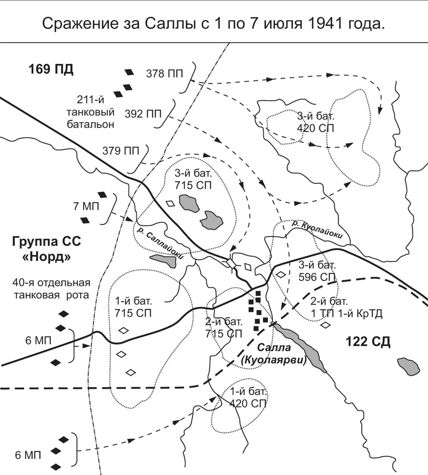 С 2 по 4 июля 1941 года немцы методично атаковали нашу оборону, очень активно используя авиацию. Постепенно вражеским штурмовым группам удалось вклиниться в боевые порядки 122-й стрелковой дивизии. 392-й пехотный полк 169-й дивизии противника смог пробиться между батальонными узлами обороны 715-го и 420-го стрелковых полков. Советские пограничники, пехотинцы и танкисты короткими контратаками сдерживали немецкое наступление, но солдаты противника 3 июля вышли к мосту через реку Куолайоки. Мост находился в глубине советской обороны, и имел важное тактическое значение. Река Куолайоки была глубокой, и переправа через нее серьезно замедлило бы наступление противника и выход его штурмовых отрядов к железнодорожной станции Салла.