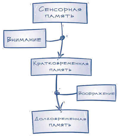 Из сенсорной памяти информация, заслуживающая внимания, переходит в кратковременную память, где может храниться несколько минут или часов. Кратковременная память задействована, например, когда мы повторяем «про себя» продиктованный кем-то телефон, одновременно ища ручку и блокнот, чтобы записать его.