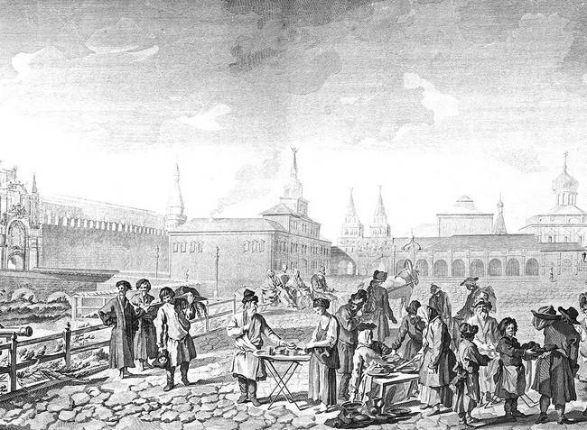 Алексей Михайлович особым указом запретил торговлю на Красной площади: «Всякими товары торговать в рядах, в которых коими указано и где кому даны места. А которые всяких чинов торговые люди ныне торгуют на Красной площади, и на перекрестках, и в иных неуказанных местах, поставя шалаши, и скамьи, и рундуки, и на веках всякими разными товары: и те шалаши, и скамьи, и рундуки, и веко с тех мест великий государь указал сломать и впредь на тех местах никому, ни с какими товары торговать, чтобы на Красной площади и на перекрестках стеснения не было»[22]. Государь боролся с московскими пожарами. Летом разрешалось топить печи только по определенным дням, всячески поощрялось каменное строительство.