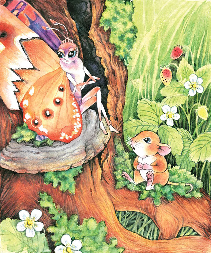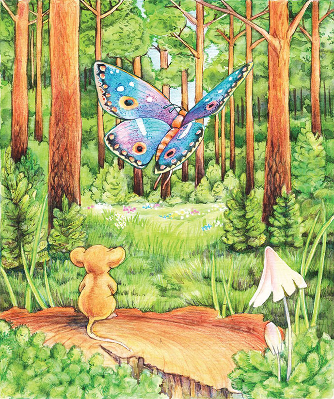 – Тебе придётся набраться храбрости и лететь к своим, на опушку леса, там много разных бабочек, может найдутся и твои родственники, – сказал Мышонок, вернувшись к заплаканной красавице. – Они смогут научить тебя, как справиться с новыми опасностями. А пока ты можешь прятаться в высокой траве. Птицам там тебя будет не достать. Не лети высоко, тогда тебя никто не заметит.