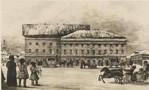 Петровский театр Медокса, где 14 мая 1783 года впервые в Москве игралась пьеса «Недоросль». Акварель Б. Земенкова. 1930-е годы