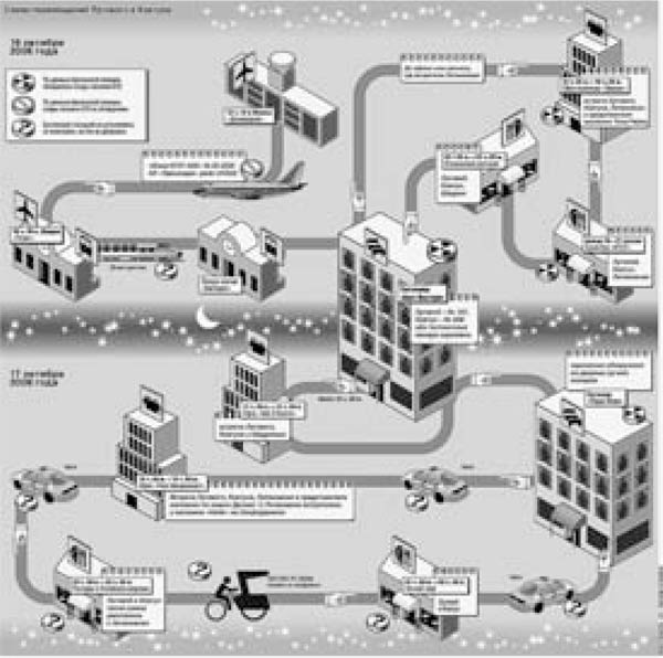 Посмотрим на (широко известную и впервые опубликованную в газете «Известия») схему перемещений Лугового и Ковтуна в промежутке между 16 и 18 октября (т. е. во время их первого визита в Лондон)[7]: