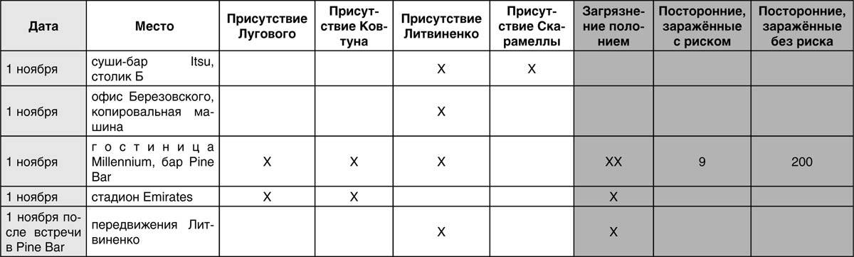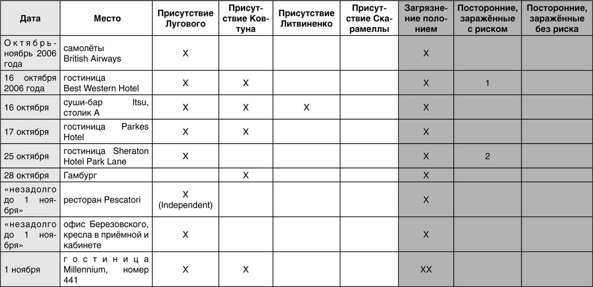 Примечание. По утверждению заместителя начальника Управления по расследованию особо важных дел Генпрокуратуры Андрея Майорова, в самолете Москва-Лондон, нескольких ресторанах и офисе Шадрина следов полония обнаружено не было.