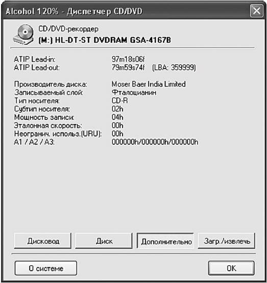 Тип красителя позволяют определить различные программы для работы с CD/DVD. Самая известная из таких программ – Alcohol 120 %. Для определения типа красителя вставьте диск CD-R в привод, запустите программу, в нижней части окна (где будет список приводов) щелкните правой кнопкой на приводе, в который вы вставили диск, и выберите команду Свойства. В появившемся окне нажмите кнопку Дополнительно – и увидите тип красителя (рис. 7.2).