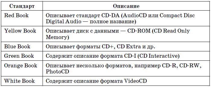 Стандарты CDСтандартов CD очень много. Самым первым стандартом была «Красная книга»: первая спецификация AudioCD была выпущена в красной обложке, поэтому ее так и назвали. После этого было выпущено еще несколько цветных книг (табл. 7.1).