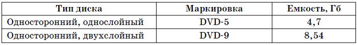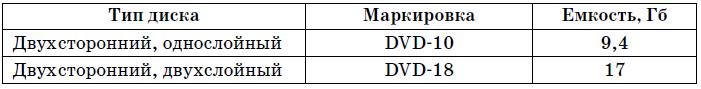 Затем были выпущены различные модификации DVD. Сначала DVD, как и CD, был односторонним и однослойным (DVD-5). Потом был создан двухслойный DVD-диск (DVD-9), затем – двухсторонний и, наконец, двухслойный и двухсторонний (табл. 7.2).