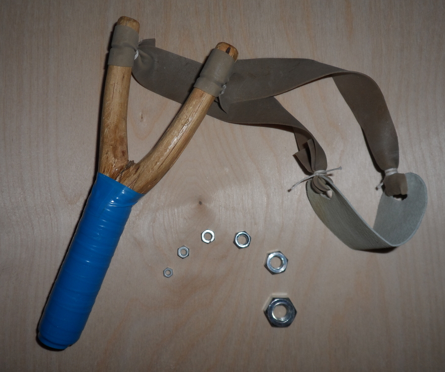П.С. не поленился, взял обрезок жгута, нашёл кусок кожи и заново оснастил рогатку. Помнят руки-то!
