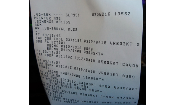 Фактическая погода EDDL (Дюссельдорф): видимость 300 метров, туман, разбросанная облачность на высоте 30 метров. В ближайшие два часа ожидается видимость 6 километров