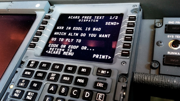 Мы почесали головы и решили поступить мудро – использовать ресурс авиакомпании. Через систему ACARS8 отправил запрос: «Погода в Дюссельдорфе плохая. Куда вы хотите, чтобы мы полетели на запасной – в Кёльн или Франкфурт?