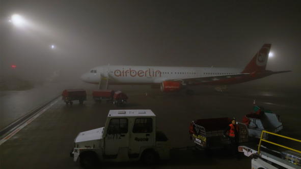 Уверенно приземлившись, наш лайнер начинает отсчитывать метры изумительно ровной ВПП Дюссельдорфа. На середине пробега мы утыкаемся в туман, но огни осевой линии святят достаточно ярко, поэтому не испытываем значимых проблем с выдерживанием направления.