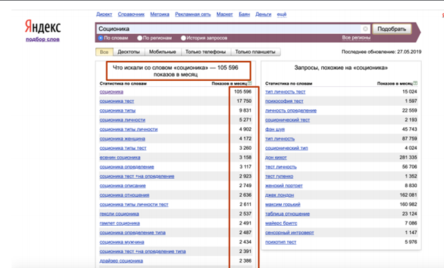 WordStat – подбор слов Яндекса – это сервис для оценки пользовательского интереса к конкретным тематикам и для подбора ключевых слов рекламодателями. Мы можем, например, задать слово «соционика» и понять по запросам, сколько людей интересовались этой темой. Через разные вопросы и ключевые слова мы увидим определенный пул запросов.
