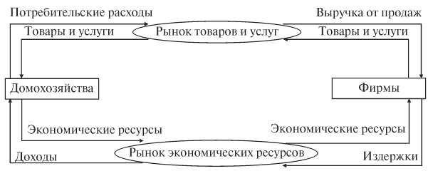 Домохозяйства покупают товары и услуги (т. е. предъявляют спрос на товары и услуги), которые производят фирмы и поставляют на рынок товаров и услуг (т. е. обеспечивают предложение товаров и услуг). Чтобы производить товары и услуги, фирмы закупают экономические ресурсы – труд, землю, капитал и предпринимательские способности (т. е. предъявляют спрос на экономические ресурсы), собственниками которых являются домохозяйства (которые обеспечивают предложение экономических ресурсов).