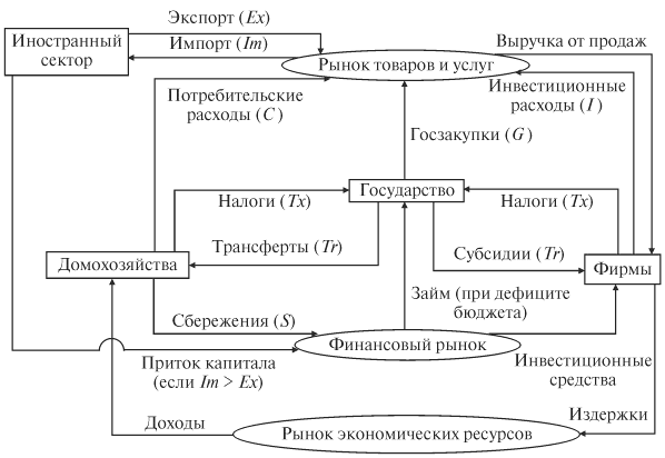 Иностранный сектор объединяет все остальные страны мира и является самостоятельным, рационально действующим макроэкономическим агентом, осуществляющим взаимодействие с данной страной посредством, во-первых, международной торговли, т. е. покупки и продажи товаров и услуг (экспорт и импорт товаров и услуг); во-вторых, перемещения капиталов, т. е. покупки и продажи финансовых активов – ценных бумаг (экспорт и импорт капитала). С учетом иностранного сектора речь уже идет об открытой экономике.