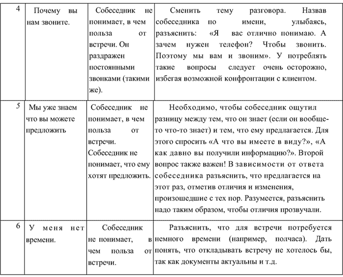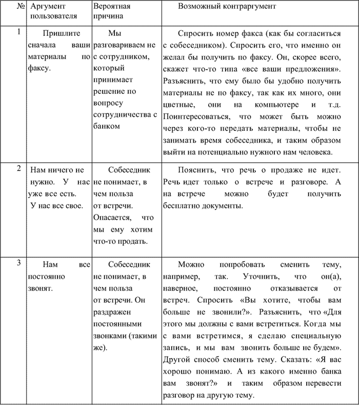 При отказе от встречи важно установить истинную причину этого отказа (она может и не соответствовать той отговорке, которую пользователь произносит). Как правило, она заключается в непонимании пользователем цели встречи. Конкретно, он не понимает, какую пользу эта встреча может ему принести. И вторая, менее распространенная причина, заключается в том, что наш собеседник в организации не принимает решения о таких встречах (либо он не является заинтересованным в услуге лицом, либо он не вправе принимать эти решения). Приведем основные отговорки потенциальных клиентов и соответствующие им контраргументы, которые следует употребить, в таблице