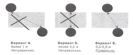 5. Необходимо при посадке следить за тем расстоянием, которое установилось между специалистом по продажам и собеседником. Расстояние не должно быть слишком маленьким или очень большим. Например, расстояние менее 50–60 см означает проникновение в «интимную зону» покупателя и может быть ему неприятно, так как в этой зоне он общается с близкими людьми. Расстояние, большее 1–1,2 м не позволит общаться так, чтобы можно было нормально говорить (не кричать), рисовать иллюстрации и показывать материалы. Таким образом, желательно располагаться на расстоянии 0,6–0,8 м. Не следует садиться прямо напротив собеседника или рядом с ним (исключая непосредственно показ демо-версии, когда по-другому сесть невозможно). Наилучший вариант – сидеть немного вполоборота.