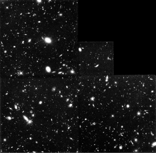 Таким образом, изображение Hubble Deep Field было собрано из 342 отдельных снимков. Его построение проводили с 18 по 28 декабря 1995 года. В этой невероятно маленькой космической области практически все 3000 объектов (за исключением нескольких звёзд с переднего плана Млечного Пути) – это галактики.