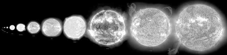 Сравнение размеров звёзд различного типа. Солнце на данном изображении слева и имеет размер в 1 пиксель