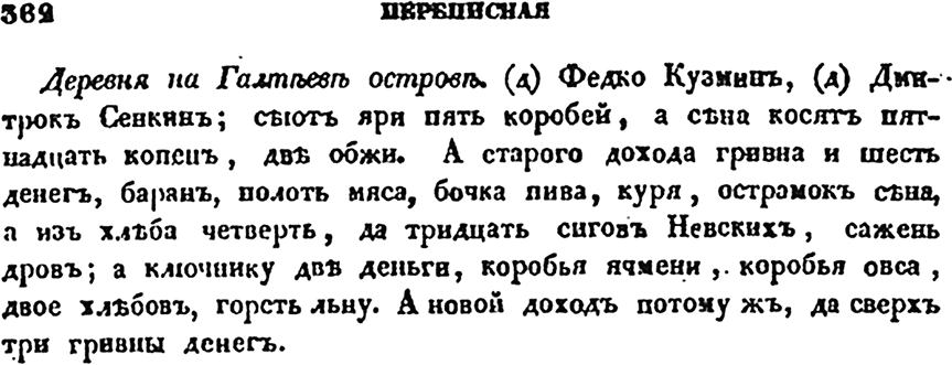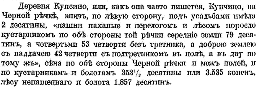 Но Купчина или какого-либо иного, созвучного наименования в окладной книге не встречается. Однако имеется запись о деревне без упоминания названия, в числе жителей коей упоминается Федко Кузмин. Эта же фамилия принадлежит и некоторым другим жителям деревень на Галтееве острове. В шведской переписи жителей деревни Купчинова 1619 года также встречается фамилия Кузьмин. Конечно, это очень распространенная фамилия, и делать далекоидущие выводы на этом основании не следует, но на заметку взять сто́ит.
