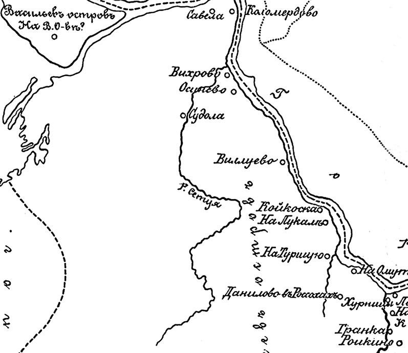 Теперь попробуем разобраться с названием реки, на берегу которой собственно и располагалась деревня, – Сетуй. По поводу второй части слова расхождений у лингвистов нет. «Уй» – по-вепсски ручей. А вот относительно первой части есть разные соображения, и притом диаметрально противоположные. По мнению А. М. Шарымова, корень «сет» входит в слова со значением «белый», «светлый», стало быть, «Сетуй» – это «Светлый ручей». По мнению С. А. Мызникова, «sit» – «кал», «уй» – «ручей», выходит – «Говенный ручей» (подобные гидронимы широко распространены в бассейне реки Свири). По-шведски имя речки звучало сходно: Sitala, Suttila, а также Situla-oo. В XVIII веке река получила более привычное название – Черная речка, затем – Волковка.