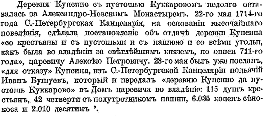 К 1713 году в деревне насчитывалось 5 крестьянских дворов, а также проживали 5 бобылей. В 1714 году деревню с прилегающей пустошью передали царевичу Алексею Петровичу. Ему же принадлежала дача «Кайкуши» (другие названия – Койкоска, Кокус). После смерти Алексея Петровича, в 1718 году, дача «Кайкуши» перешла в Дворцовое ведомство, а деревню Купчина (Купсина) возвратили Александро-Невскому монастырю.