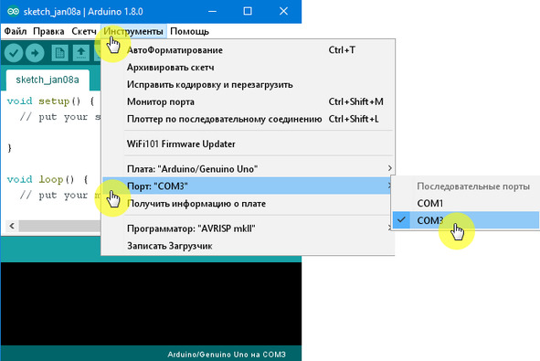 Запустите Arduino IDE и укажете, к какому COM порту подключена плата Arduino. Выберите раздел меню Инструменты, затем Порт, укажите порт.