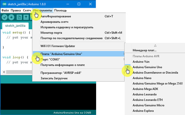 Далее необходимо убедиться, что выбрана именно плата Arduino UNO. Выберите раздел меню Инструменты, затем Плата и выберите плату Arduino UNO.