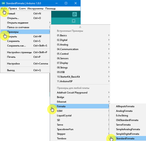 Теперь необходимо загрузить в плату Arduino специальный скетч, с помощью которого она будет связываться с компьютером. Скетч называется StandardFirmata. Для того чтобы загрузить его, выберите раздел меню Файл, Примеры, Firmata, и затем StandardFirmata.