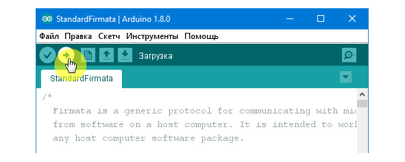 После того, как вы выберете скетч StandardFirmata, он появится в окошке Arduino IDE. Теперь необходимо загрузить его в плату Arduino – прошить ее. Для этого нажмите на кнопку Загрузка.