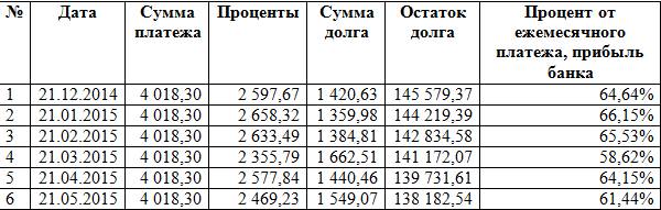 Не знаю, знаешь ты об этом или нет, может это для тебя еще секрет, но 60-95% ежемесячного платежа по кредиту составляет процент банка и выплачивается тобой в первые 30% срока кредита. То есть, если ты взял кредит на 5 лет, то проценты по кредиту составят за первый год 70-95%, второй год 60-80%, третий год 50-60%, четвертый год 30-40%, пятый год 20% и менее. Иначе говоря, даже если ты рассчитаешься досрочно за кредит, скажем за 3 года, то банк в любом случае получит максимальную прибыль за первые 2 года. Если не веришь, проверь сам. Возьми график платежей и вычисли процент от ежемесячного платежа по кредиту, который и составит процент банка.