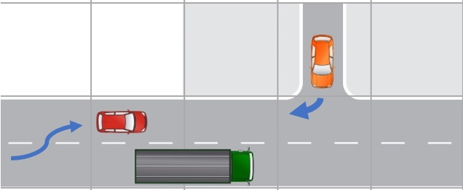 Ситуация 1: Вы двигаетесь по двухполосной дороге с разрешенной скоростью, и догоняете грузовик или трактор, который едет со скоростью 25–30 км/ч. Поскольку встречная полоса свободна и обгон разрешен, вы решаете обогнать его, и начинаете маневр.