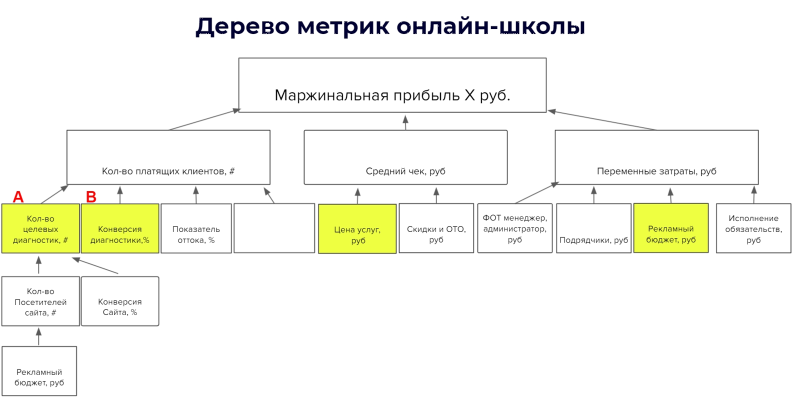 Посмотрите внимательно на ключевые метрики и определите, что в вашем дереве будет первым и вторым приоритетом на ближайший месяц. Отметьте это буквами A и B. Обычно фокус распределяют следующим образом: 60% внимания на метрику категории «А», 30% на метрику «B» и 10% на «неважное».