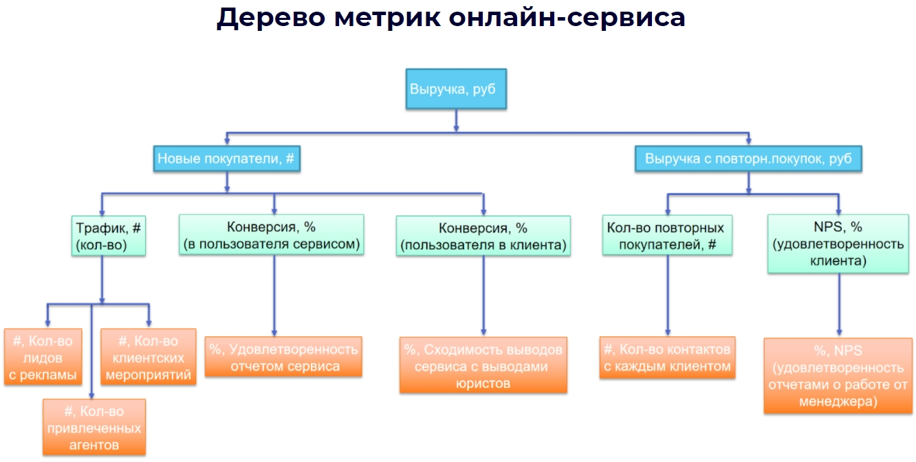 Дерево метрик можно строить не только на всю компанию, но и на любое подразделение, отдельный продукт или бизнес-показатель, на который нужно повлиять. Это очень удобный и наглядный инструмент, возьмите его на вооружение.