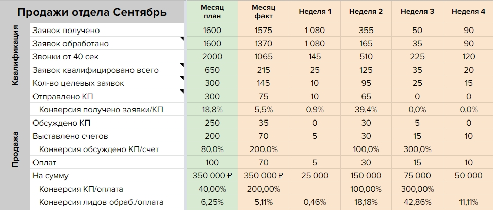 Иногда спрашивают, почему не подходит аналитика из CRM. Она походит, если вы умеете в ней делать еженедельную динамику план/факт. Чаще всего из CRM осуществляется выгрузка в таблицу, а таблица автоматически сводится в нужные еженедельные отчеты.