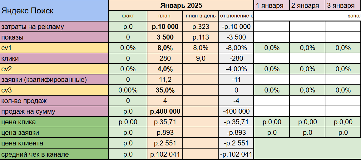 Каждый рекламный канал в файле представлен блоком показателей, который начинается с «затрат на рекламу» и завершается качественными показателями по цене заявки и клиента. Заполнять в этом файле необходимо только белые ячейки, все остальное считается автоматически.