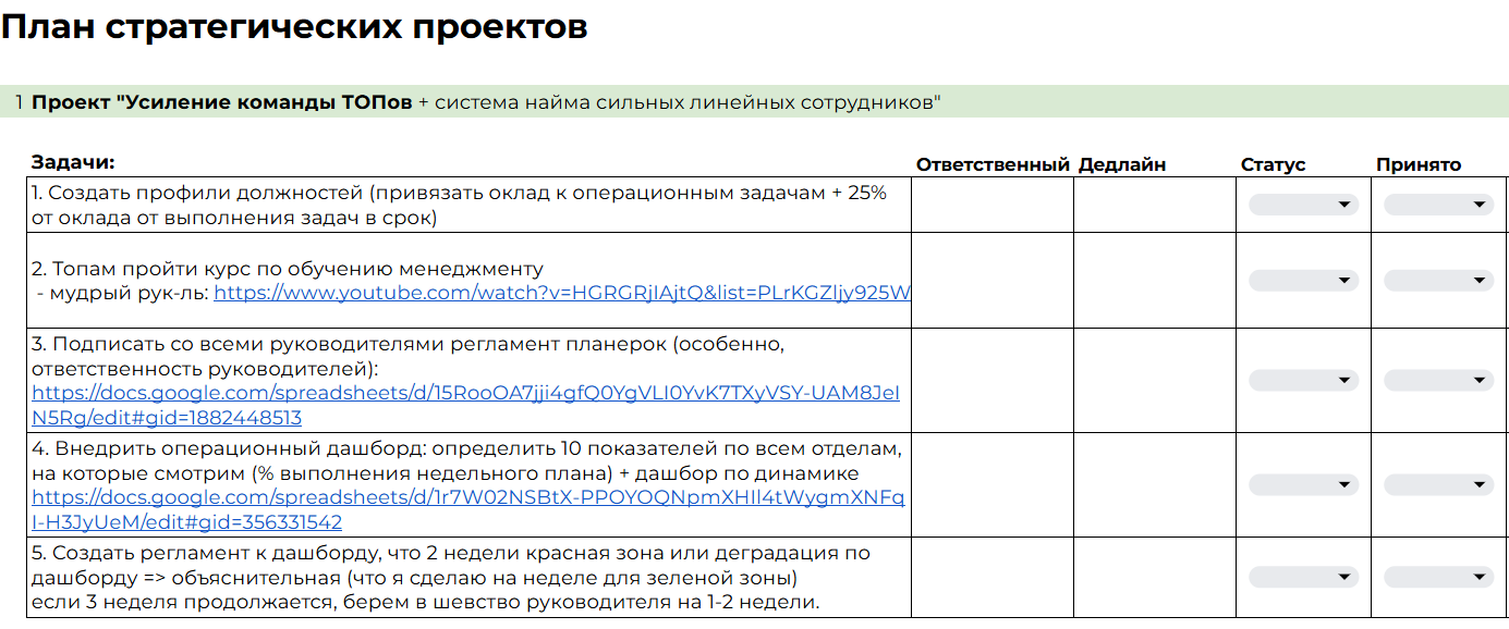 Поэтому наша базовая рекомендация – привязать выполнение «проектов развития» к части зарплаты руководителя. В этом случае у директора появляется действительный рычаг влияния на своих руководителей. Пример такой системы мотивации вы сможете найти в файле-шаблоне руководителя отдела продаж.