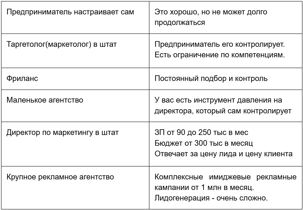 Часто маркетолог, который идет в штат, не имеет достаточного опыта по некоторым рекламным каналам. У него есть какие-то знания, например, по платформе Яндекс или Вконтакте. А рекламный кабинет Telegram Ads или закупы у блогеров могут быть для него новыми инструментами. В результате, такой маркетолог будет экспериментировать и учиться на ваших деньгах