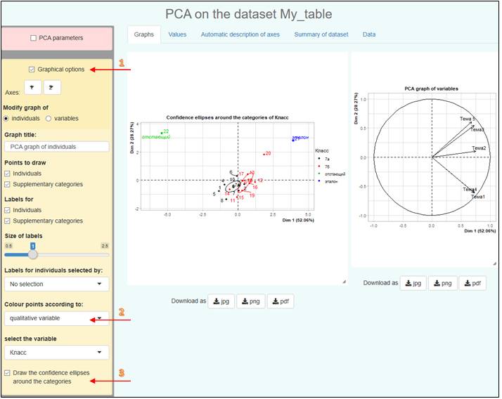 В открывшемся окне браузера настроим некоторые опции. Под номером 1 на рисунке отмечено включение дополнительных параметров построения графика; ПОД номером 2 настраивается способ выделения переменных цветом; под номером 3 включается изображение эллипсов доверительных интервалов значений переменных из разных категорий: