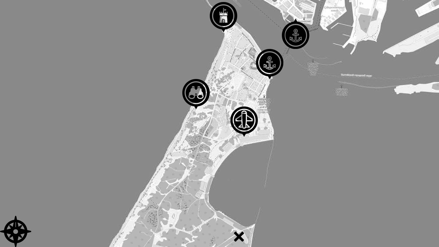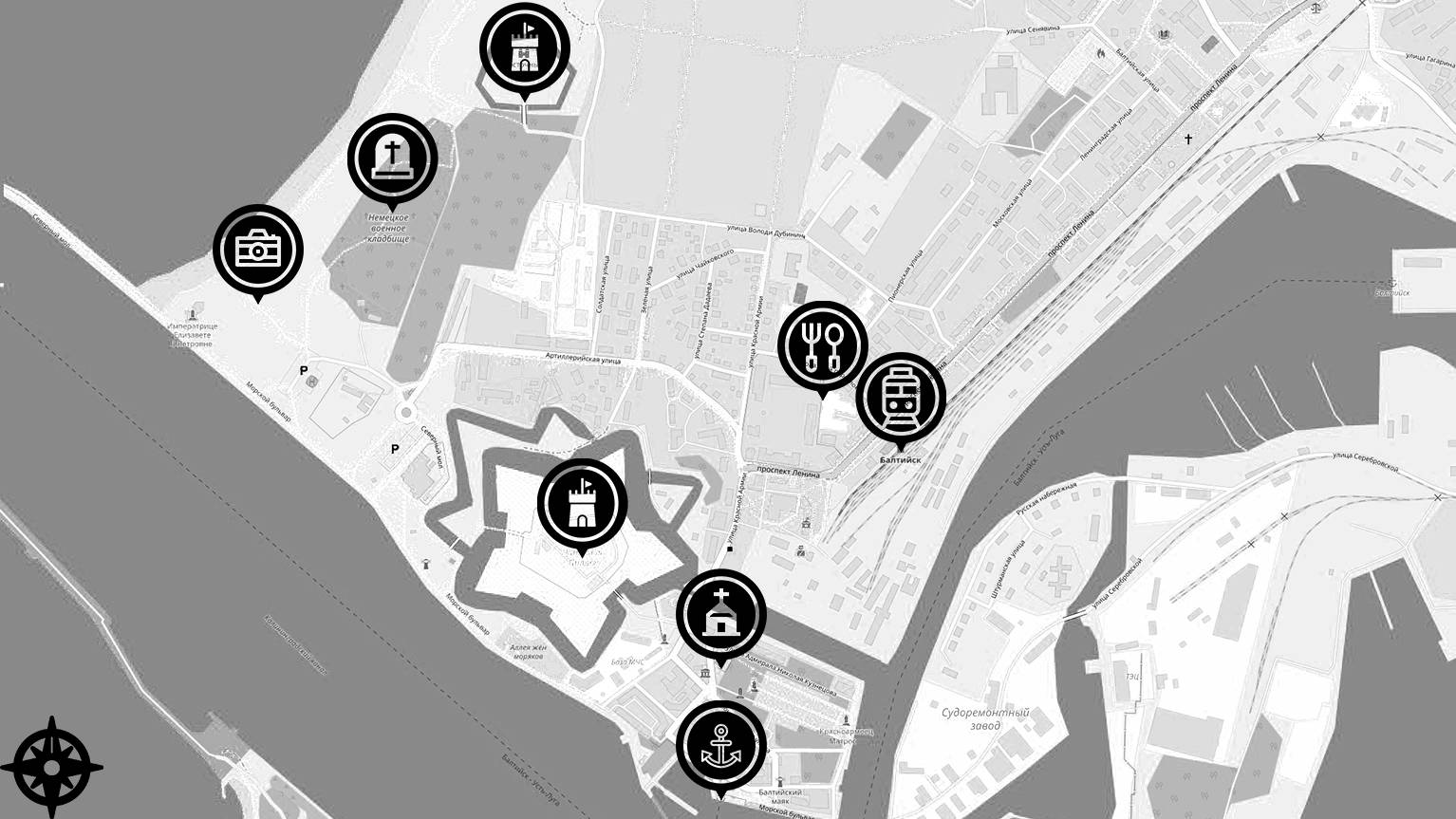 На карте отмечены (слева направо): точка обзора памятника императрице Елизавете Петровне, мемориальное кладбище, форт «Восточный», крепость Пиллау, причал речного вокзала Балтийска, кирха Пиллау, столовая «Гараж», станция Балтийск.