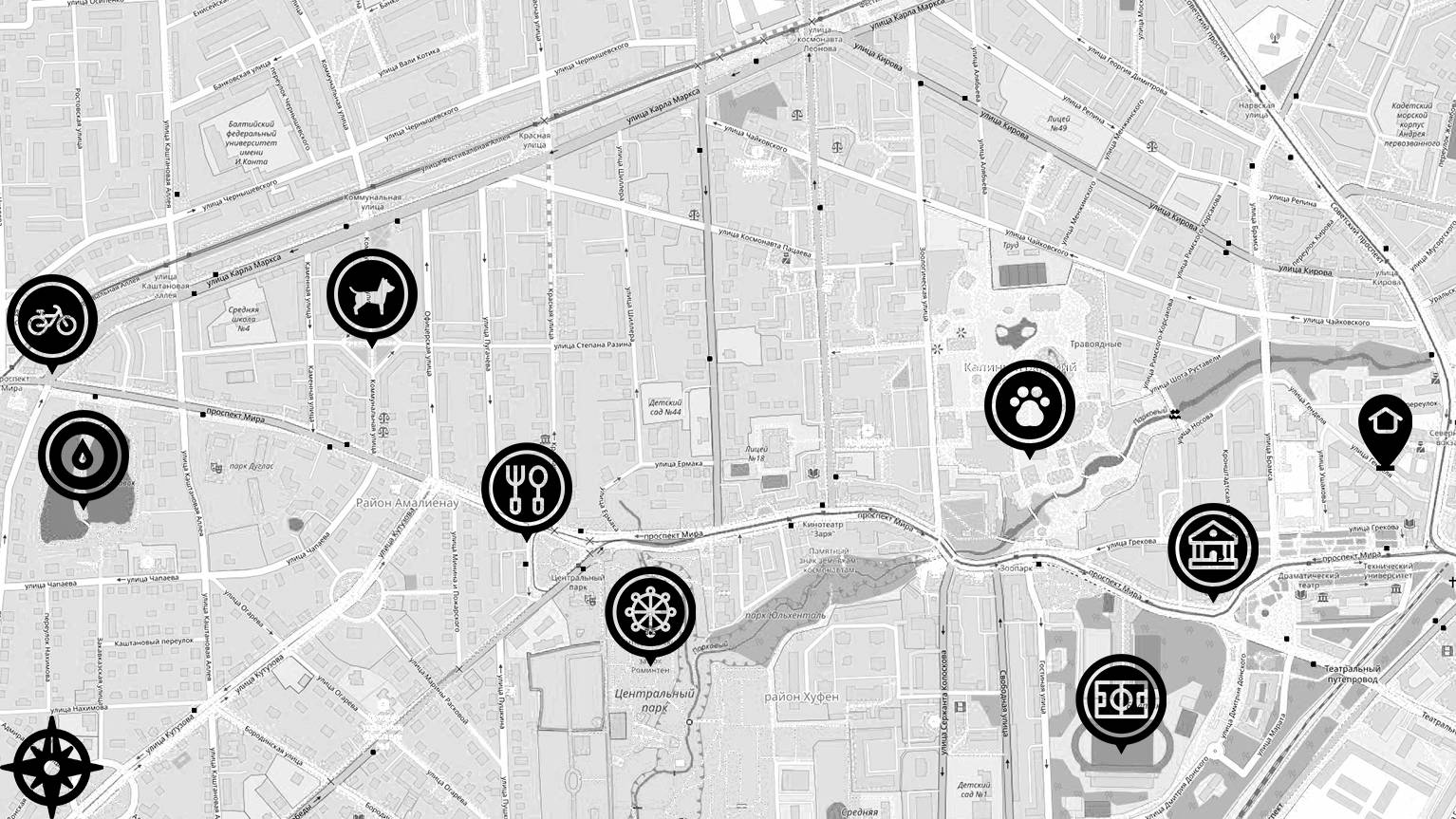На карте отмечены (слева направо): арт-объект «Велосипед», пруд «Поплавок», сквер Фредерика Шопена, столовая «Поварешка», ЦПКиО, Калининградский зоопарк, стадион «Балтика», Калининградский областной драматический театр («Луизен-театр»), гостевой дом Quokka.