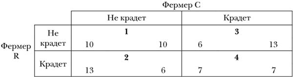 Одним из камней преткновения для моделей рационального актора является дилемма заключенного (ДЗ). Пример игры ДЗ представлен в табл. 2.1. Предположим, два фермера живут по соседству. Если каждый занимается только своими полями, то при оптимальном соотношении затраченных усилий и дохода от продажи зерна итоговая полезность каждого составляет 10 единиц (ячейка 1). Однако если фермер R посвятит часть времени краже у фермера С, он может получить больше зерна, чем получит со своих полей, отдавая ту же часть времени им. Его полезность поднимается до 13 единиц, при условии что фермер С по-прежнему отдает все силы своим полям. При этом полезность фермера С падает до 6 единиц, поскольку он теряет часть зерна, переходящую к фермеру R (ячейка 2). Если, наоборот, фермер С крадет, а фермер R не крадет, показатели полезности меняются местами (ячейка 3). Если же оба они крадут, то полезность каждого составляет лишь 7 единиц (ячейка 4). Таким образом, оба проигрывают, если крадут; тем не менее кража является доминирующей стратегией обоих фермеров: каждый получает бóльшую выгоду, если крадет вне зависимости от того, какую стратегию выбрал другой (13 единиц вместо 10, 7 вместо 6). Итак, дилемма заключенного приводит к парадоксальному результату: по отдельности участники ведут себя рационально, но коллективный итог их действий для обеих сторон оказывается хуже, чем любой из других возможных.