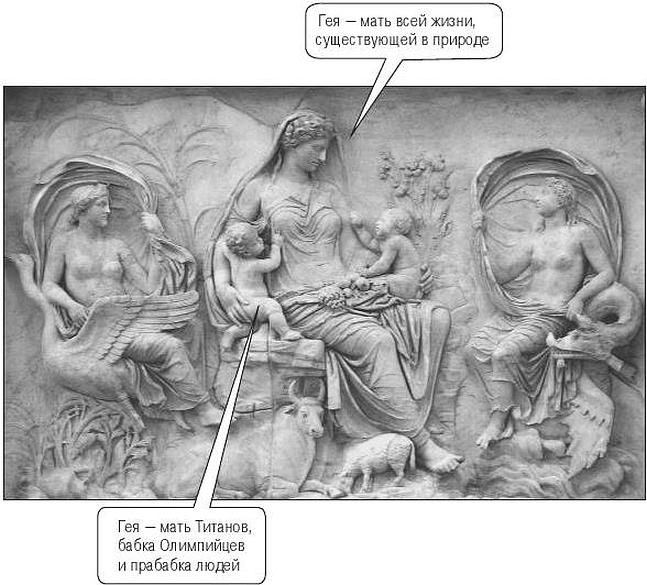 В греческой мифологии Гея – Мать Земля. Ее супруг Уран, звездный небосвод, страстно прижимался к ней и не давал ей свободного пространства. Для ее сына Хроноса единственным способом покинуть утробу Геи было оскопление собственного отца. Из капель крови родилась Афродита, богиня любви, и Эринии, богини возмездия, которые яростно защищали свою мать. Затем Хронос провозгласил себя царем и, к ужасу Геи, съел собственных детей, дабы они не лишили его власти так же, как он лишил власти своего отца. Гея спасла от жестокости Хроноса одного из сыновей, Зевса, тайно вырастила его, и в конце концов Зевс напал на Хроноса и убил его. В честь победы Зевс провозгласил себя отцом богов и выбрал своей резиденцией гору Олимп, достающую до небес. Гея осталась Матерью Землей, почитаемой, но далекой.