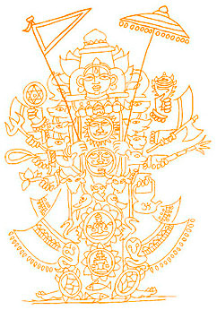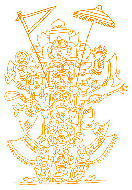 Ганга-махатмья[8]Индуистским божеством может быть простой камень в пещере, дерево, растущее в саду, река, протекающая в долине, корова, бродящая по улицам, или, например, изысканно украшенный идол из камня, глины или металла, стоящий в храме. Все может быть Богом до тех пор, пока оно соответствует человеческим ожиданиям. Во многих святилищах идолов очеловечивают, просто добавив к камню пару глаз или пару рук. Глаза символизируют органы чувств, а руки – органы действий. Это значит, что божество обладает сознанием, чувствами и способно отвечать на молитвы.