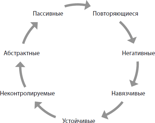 Навязчивые. Повторяющиеся негативные мысли появляются неожиданно. В вашей голове может возникнуть абсолютно любая мысль, образ или воспоминание, которые затянут вас в ловушку ПНМ прежде, чем вы это осознаете. Ронда пыталась сосредоточиться на работе, а в голову ей могла прийти мысль о том, как дела у ее сына в школе. Беспокойство о будущем и отсутствие амбиций могут образовать порочный круг, который будет всячески мешать вам сосредоточиться на работе.