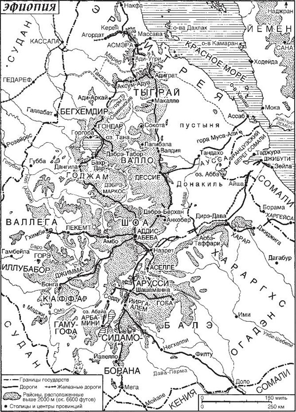Прилагающаяся карта (рис. 1) дает упрощенную картину топографии эфиопского государства внутри его современных границ. Самые высоко расположенные части страны, лежащие на высоте, превышающей 2000 м (6600 футов), на карте затемнены, они занимают большую площадь, разделенную, однако, на две самостоятельные системы долиной Рифт с цепочкой озер. Северное и Западное нагорья образуют основную часть десяти эфиопских провинций, начиная от Эритреи, занимающей самое северное положение, до Гаму-Гофа на юге. Наивысшая точка, расположенная в Семиенских горах, к северо-востоку от озера Тана, поднимается на высоту более 4600 м, здесь иногда случаются сильные снегопады; в этом районе также находится много других горных вершин, превышающих отметку 4000 м (13 000 футов). Почти вся территория этого высокогорья, немного наклоненная к западу, несет свои воды в Нил, в основном в верхний Голубой Нил, вытекающий из озера Тана и текущий далее, образуя большую петлю вокруг старой амхарской провинции Годжам. Только менее значительные реки пробиваются через крутой западный склон, чтобы влиться в Аваш, которая в конце концов сама теряется в Данакильской пустыне на границе с Французским Сомали. Самая южная точка западного высокогорья тоже относится к бассейну долины Рифт. Многие ручьи несут свои воды в семь озер, расположенных в эфиопской части долины, тогда как всего одна большая река – Омо – течет на юг к озеру Рудольф, которое полностью, за исключением самого северного края, находится на территории Кении.