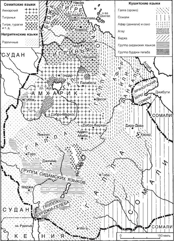 Дальнейшее изучение карты языков покажет, что некоторые другие народы также разделяют северо- запад Эфиопии вместе с галла. Среди них, например, гураге, говорящие на языке родственном семитскому, чье происхождение – загадка. Остаток составляют несимитизированные хамиты, говорящие на языках кушитской семьи, но не столь близкие другим кушитским языкам: они представлены как группа сидама и группа бурджи-гелеба. Дисперсное распределение этих двух языковых групп предполагает, что племена, говорящие на них, рассеялись на куда как больших территориях перед вторжением галла, которые, как известно, вытеснили последних из этих обширных мест. И далее к юго-западным границам государство населено малоизвестными негритянскими племенами, территория которых простирается до Белого Нила и его притоков. Остается сказать несколько слов о кочевнических племенах восточных равнин народа Сомали, ныне протянувшихся на территории Африканского Рога. В данном случае они должны были прибыть на эти территории в сравнительно недавнее время: часть их страны галла заселили всего несколько сот лет назад. Территория Сомали включает не только большое новое государство Сомали, но и значительную часть северо-востока Кении и эфиопский Огаден, в то время как во Французском Сомали они встречают народы данакиль на самой северной окраине их поселения. Это огромное пространство достаточно сухих земель, мало населенное группами кочевников, чей жизненный уклад полностью зависит от верблюдов.
