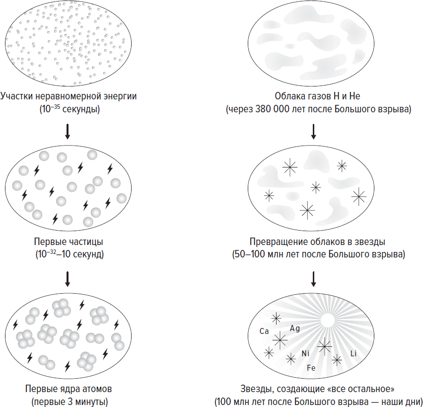 Как мы уже описали, через 10–43 секунды после Большого взрыва Вселенная стремительно расширилась от размера квантовой частицы до объема грейпфрута. Для сравнения: если бы расширение продолжилось с прежней скоростью, то грейпфрут вырос бы до размеров нынешней Вселенной за доли секунды, а не за 13,8 миллиарда лет. В течение той первой доли секунды в распределении энергии образовались крошечные неравномерности. В отдельных точках, рассыпанных по космическому грейпфруту, было немного больше энергии, в отличие от почти равного ее распределения в остальной части Вселенной. Именно эти крохотные точки с чуть большим количеством энергии породили звезды, галактики, планеты и дали старт усложнению структур, которое формирует нашу историю. Без этих неравенств во Вселенной не началось бы усложнение, и наша книга оказалась бы значительно короче.