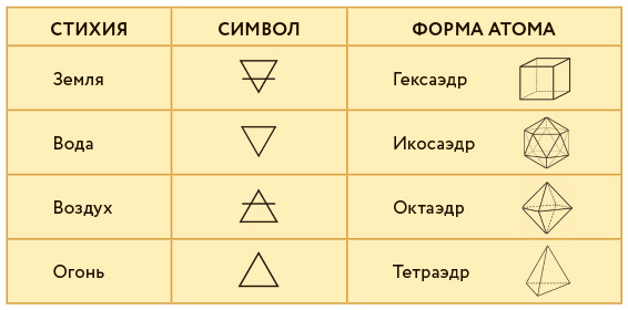 Форму атомов позже описал афинский философ Платон (428/427 или 424/423 – 348/347 годы до н. э.). Согласно его теории тел, частицы-атомы четырех стихий представляют собой полиэдры, правильные геометрические многогранники. Атомы огня – это четырехгранные тетраэдры, атомы земли – шестигранные гексаэдры, или, иначе говоря, кубы, атомы воздуха – восьмигранные октаэдры, а атомы воды – икосаэдры, то есть двадцатигранники.