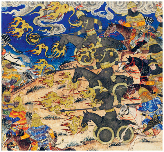 «Железная конница» Александра Македонского сражается с индийским царем Пором. «Шахнаме» («Книга царей»), синтетические краски и позолота, Персия, около 1330–1340 года.