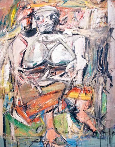 В 1953 году де Кунинг представил в нью-йоркской галерее Сидни Джениса Картины на тему женщины. Показанные на этой выставке работы вошли в число самых знаменитых произведений нью-йоркской школы; они изображают женские тела, в которых чувствуются переклички как с доисторическими богинями плодородия вроде Венеры Виллендорфской, так и с красотками с календарей 1940-х годов. В контексте творчества де Кунинга Женщины связаны с этюдами мужских и женских фигур, которые он писал в конце 1930-х – 1940-х годах: тела там то распадались на множество биоморфных форм, то вновь собирались из них воедино. На протяжении 1940-х годов даже самые, на первый взгляд, беспредметные картины де Кунинга включали в себя подобные органические формы, образуя абстрактные поля, напоминающие изгибы раскрепощенной плоти. В Женщинах начала 1950-х насилие, имплицитно присутствующее и в более ранних фигуративных работах художника, усугубляется «шлепками» красочных полос, идущих через весь холст, и преувеличением грудей, губ и глаз, в котором часто узнаются огрубленные, карикатурные образы гротескной сексуальности (илл. 7). Как для исследовательниц-феминисток 1980-х и 1990-х годов, так и для многих критиков-мужчин 1950-х эти работы стали проявлением гендерной политики, характерной не только для де Кунинга, но и для абстрактного экспрессионизма в целом, где жестуальный акт мужчины-художника метафорически соотносится с мужской сексуальной потенцией и с патриархальными ценностями, прославляющими ее как источник всего человеческого творчества. Уже в 1953 году Сидни Гайст в рецензии на выставку в галерее Джениса ясно выразил эту точку зрения: «В жесте, родственном половому акту, [де Кунинг] обрушивает насилие на холст, который и есть женское тело».