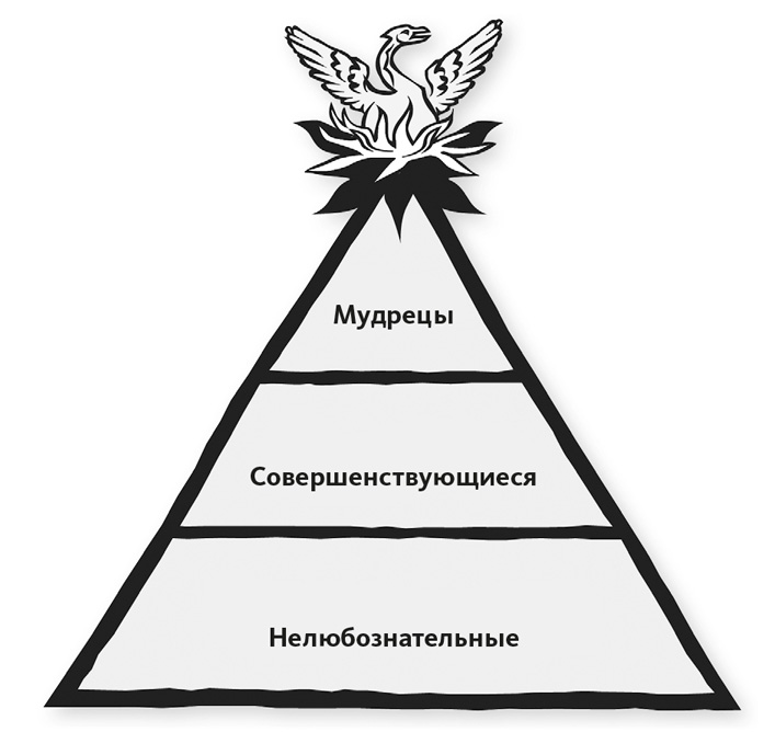 Группа нелюбознательных в нижней части моей философской пирамиды соответствует людям, которых Сократ называл «не ведающими»: они не осознают, что не обладают мудростью, и поэтому у них не возникает желания искать ее. (Хуже того, некоторые люди из этой группы могут быть убеждены, что уже достигли мудрости, что также подавляет желание совершенствоваться.)